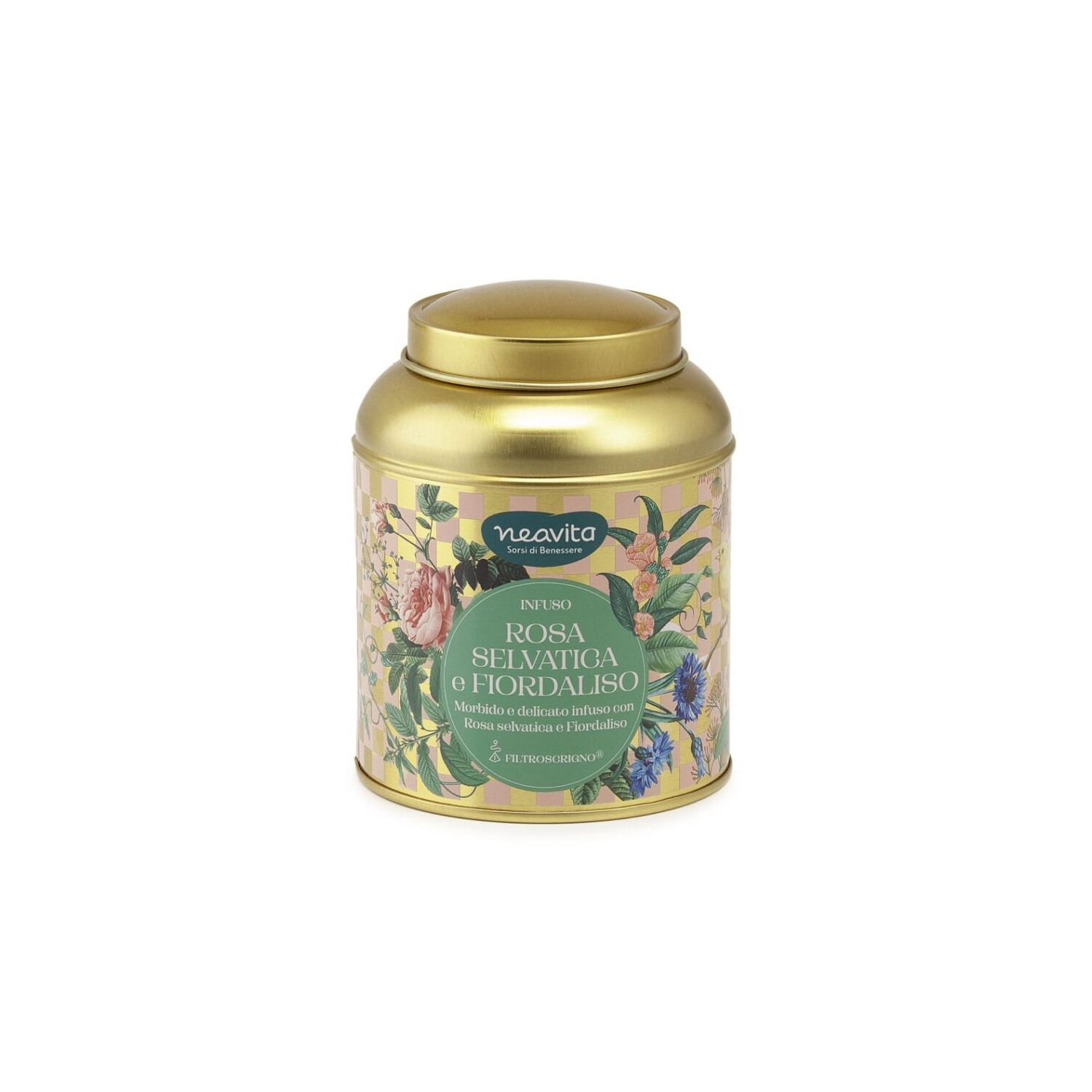 Miscela di erbe, frutti e fiori per infusione in un bellissimo caddy di metallo. Questo caddy contiene 12 filtroscrigno Ingredienti: Pezzi di mela, fiori di ibisco, foglie di lemongrass, foglie di Ilex Guayusa, foglie di stevia, fiori di fiordaliso, boccioli di rosa, aromi naturali di pesca e rosa