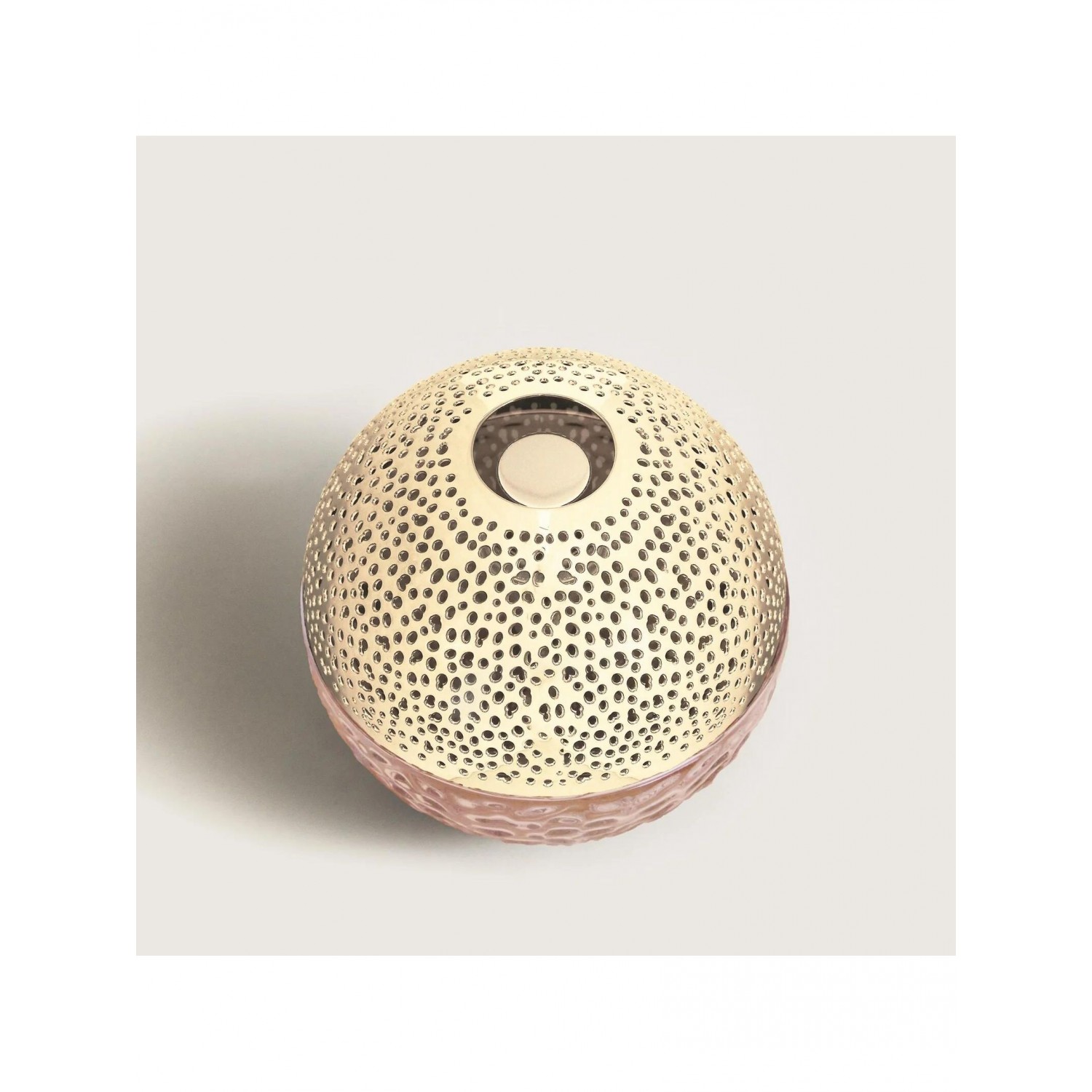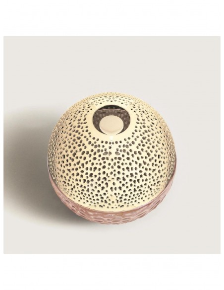 La sua superficie irregolare e il suo colore minerale trasparente gli conferiscono un carattere unico. La sua forma sferica, piena di morbidezza, è composta da un lato di vetro martellato e l'altro da una magnifica cornice traforata in oro metallizzato. Questa combinazione di materiali crea un effetto di texture sottili, che si uniscono come una cosa sola, in perfetto equilibrio.