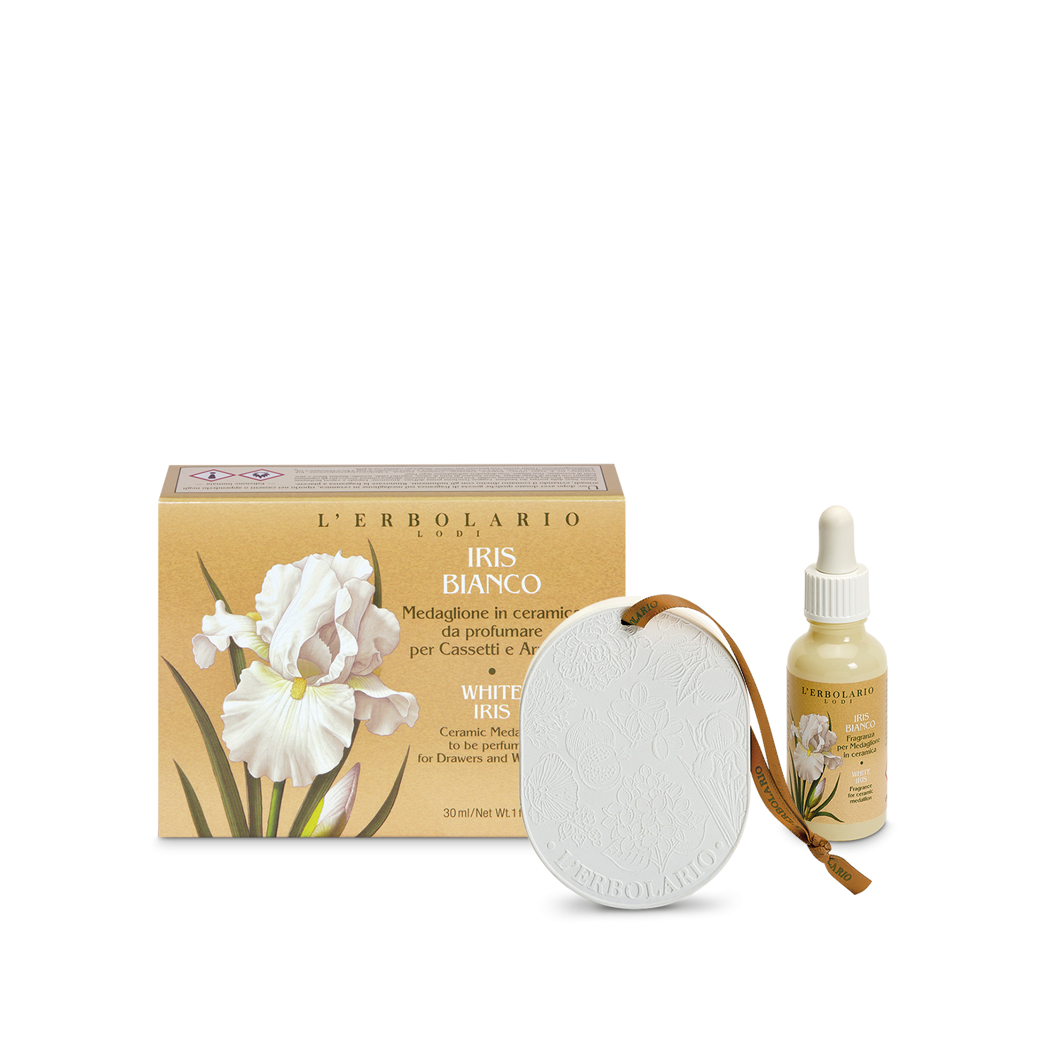 Basta dosare qualche goccia di fragranza sul medaglione in ceramica per profumare cassetti o armadi con le note pure e fresche di Iris Bianco.